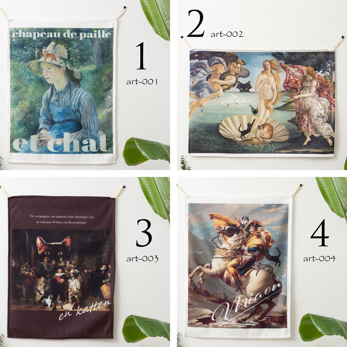 ゴッホやモナリザ、フェルメール、モネ、ミュシャなどの絵画にちゃっかりまぎれる動物デザイン。お部屋の雰囲気をさりげなくおしゃれに演出してくれます。