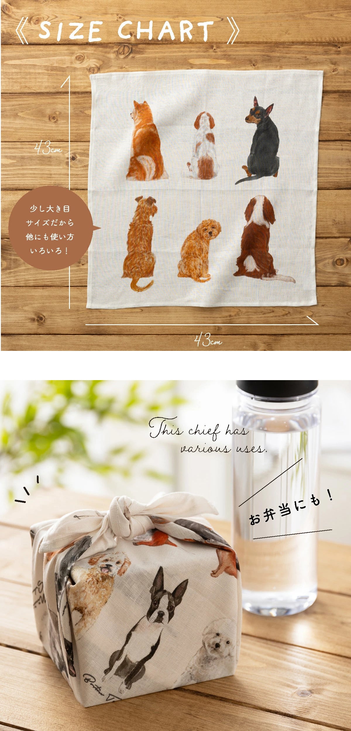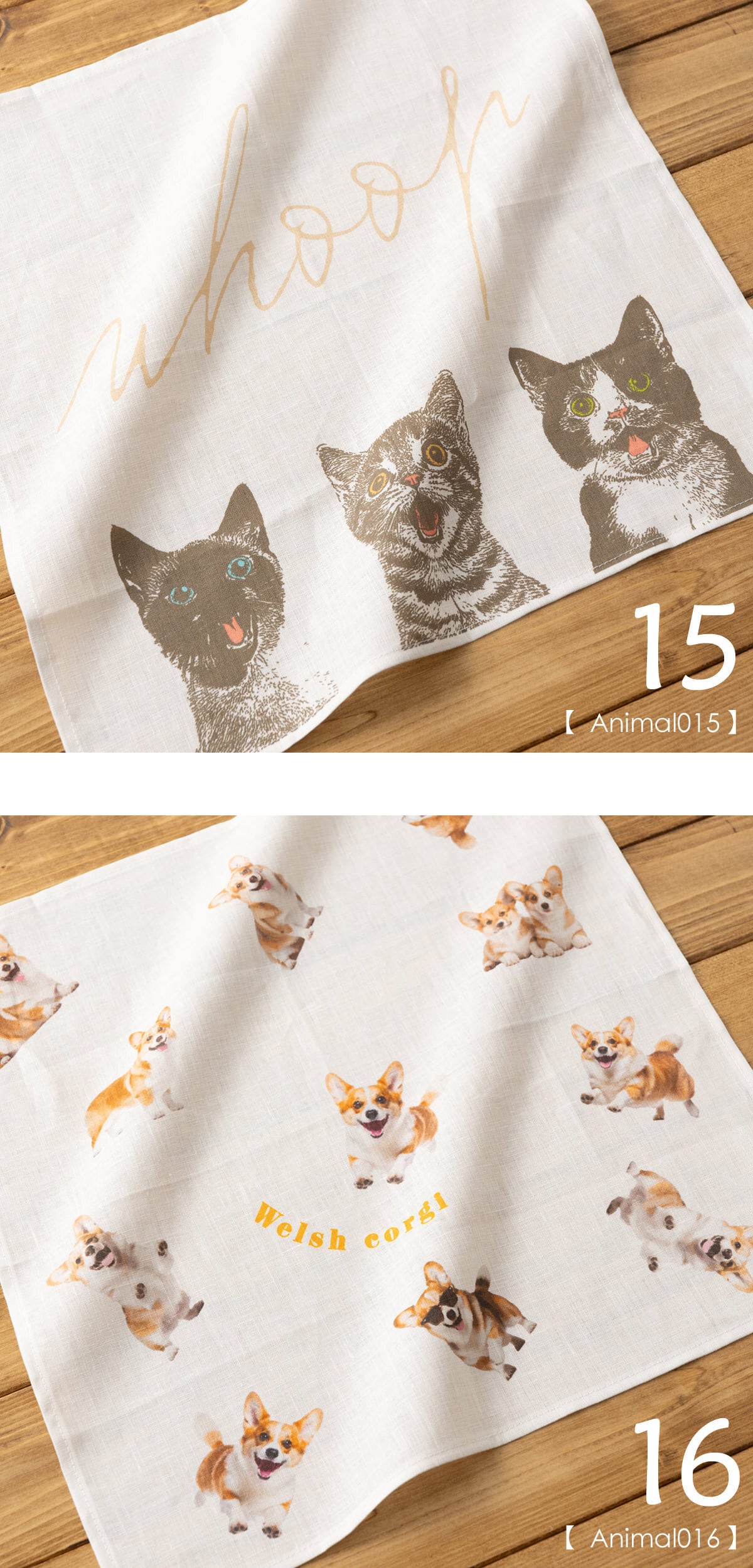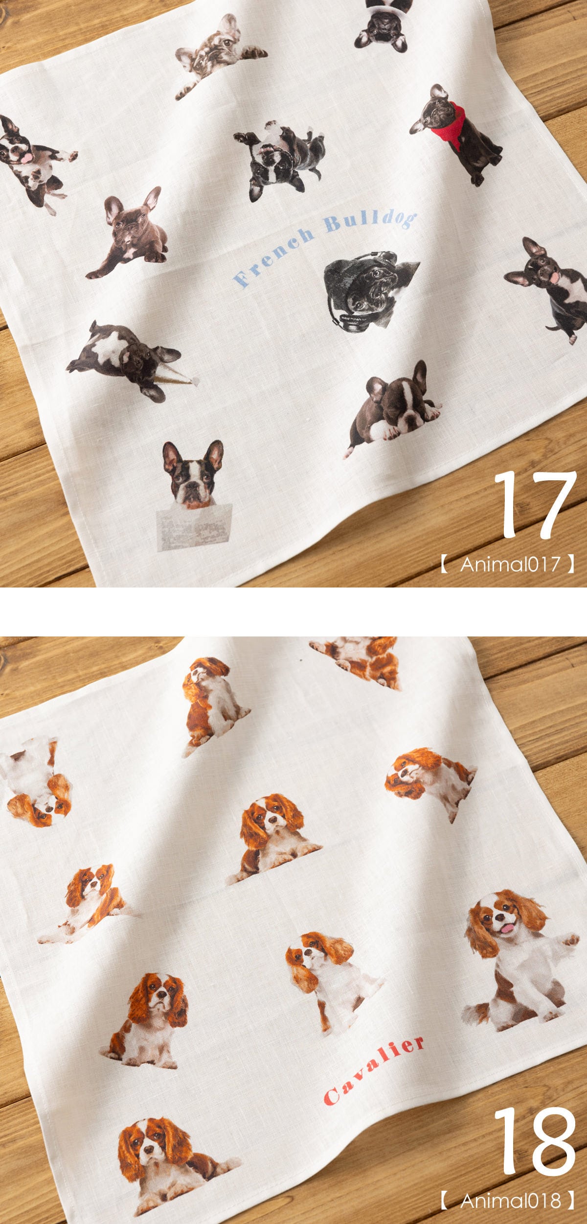 大きめリネン100%ハンカチ キャット&ドッグ 43×43cm